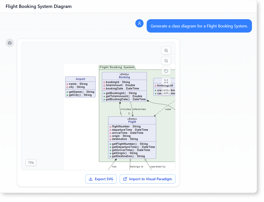Imagine you’re designing a Flight Booking System. You need to see how passengers, flights, bookings, and airlines connect. Instead of spending hours sketching classes and relationships, you can ask a simple question and get a clear, structured class diagram instantly.