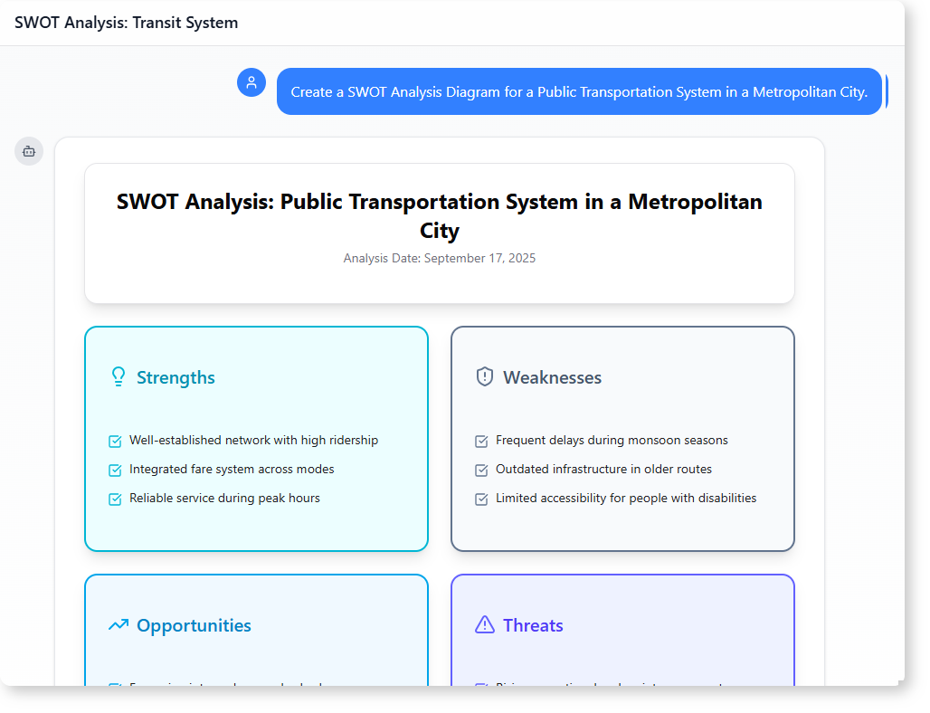 Just ask the AI to generate a class diagram or summarize class responsibilities—and get a clear, structured view of your system in minutes.