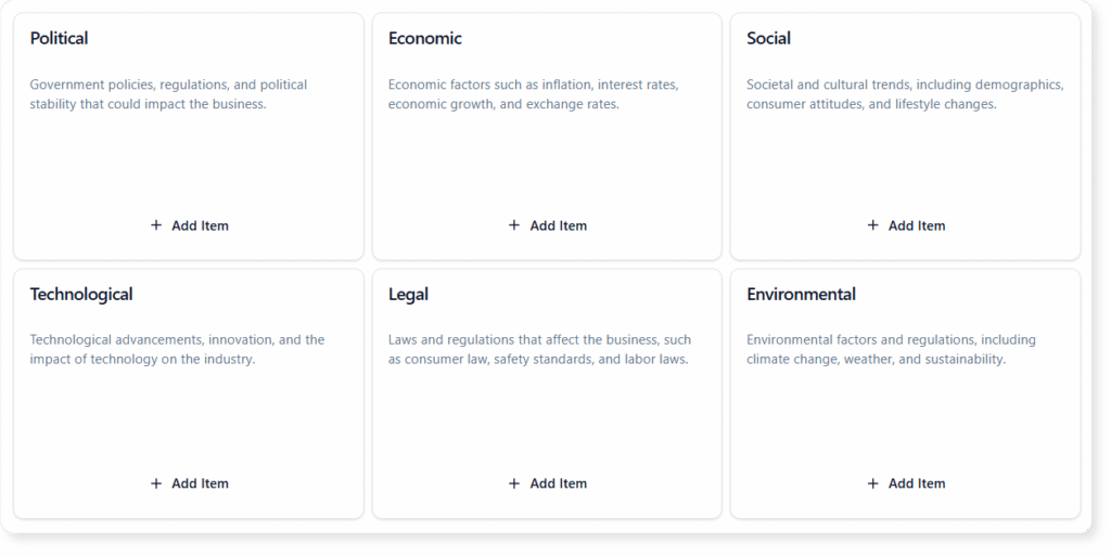 How it works: You simply input a prompt related to your strategic goal, such as “PESTLE Analysis for Starbucks Global Expansion.” The AI engine scans vast amounts of data to identify relevant factors across all six PESTLE categories specific to the international coffee industry. This provides an immediate foundation to build upon.