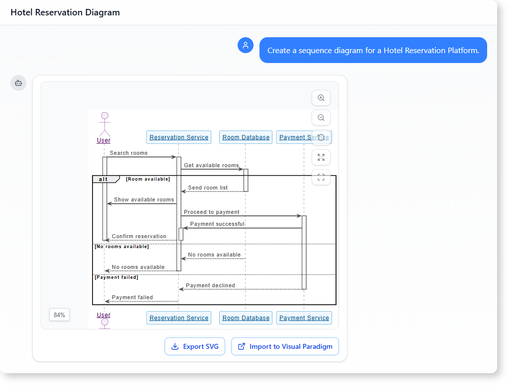 The diagrams generated by the AI chatbot can be imported into the full Visual Paradigm desktop tool for further refinement. This means users who want to refine their analysis—add more detail, export for presentations, or collaborate with stakeholders—can continue working in a unified environment.